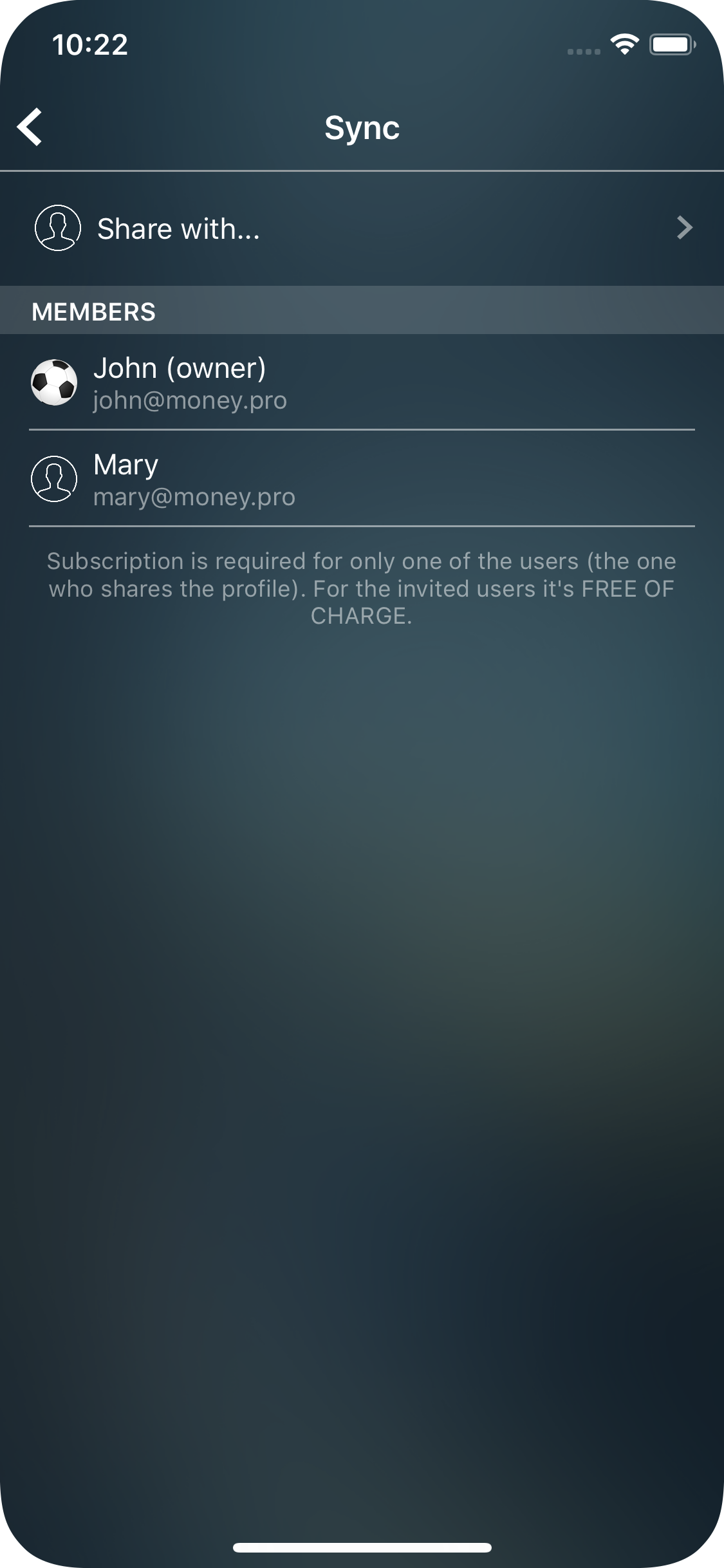 1. You’ve already set up Money Tracker Sync on your device. Now you need to invite another user. Go to More > Sync and tap “Share” next to the profile you want to share.