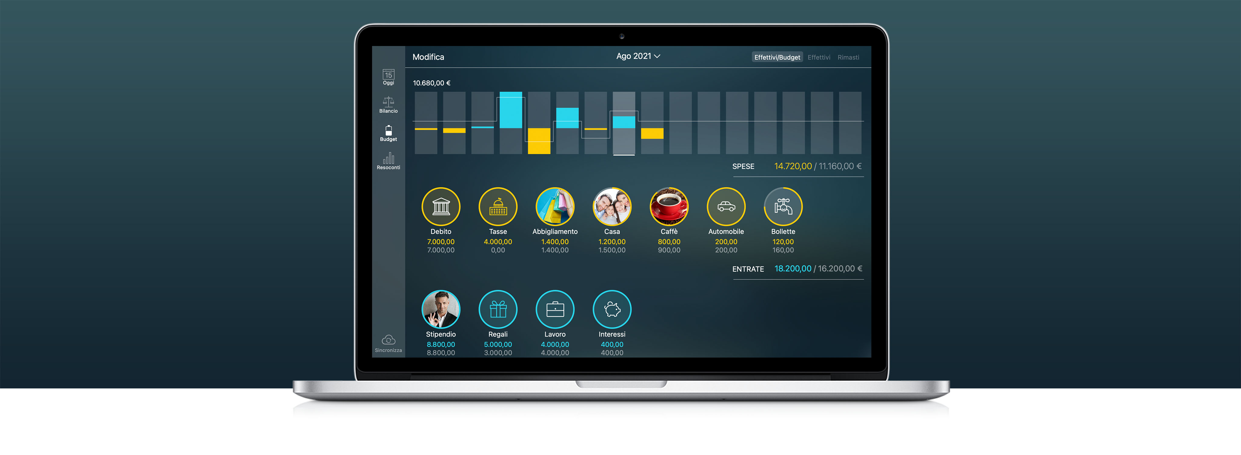 - Personalizzazione di conti e categorie con oltre 1.500 icone integrate.